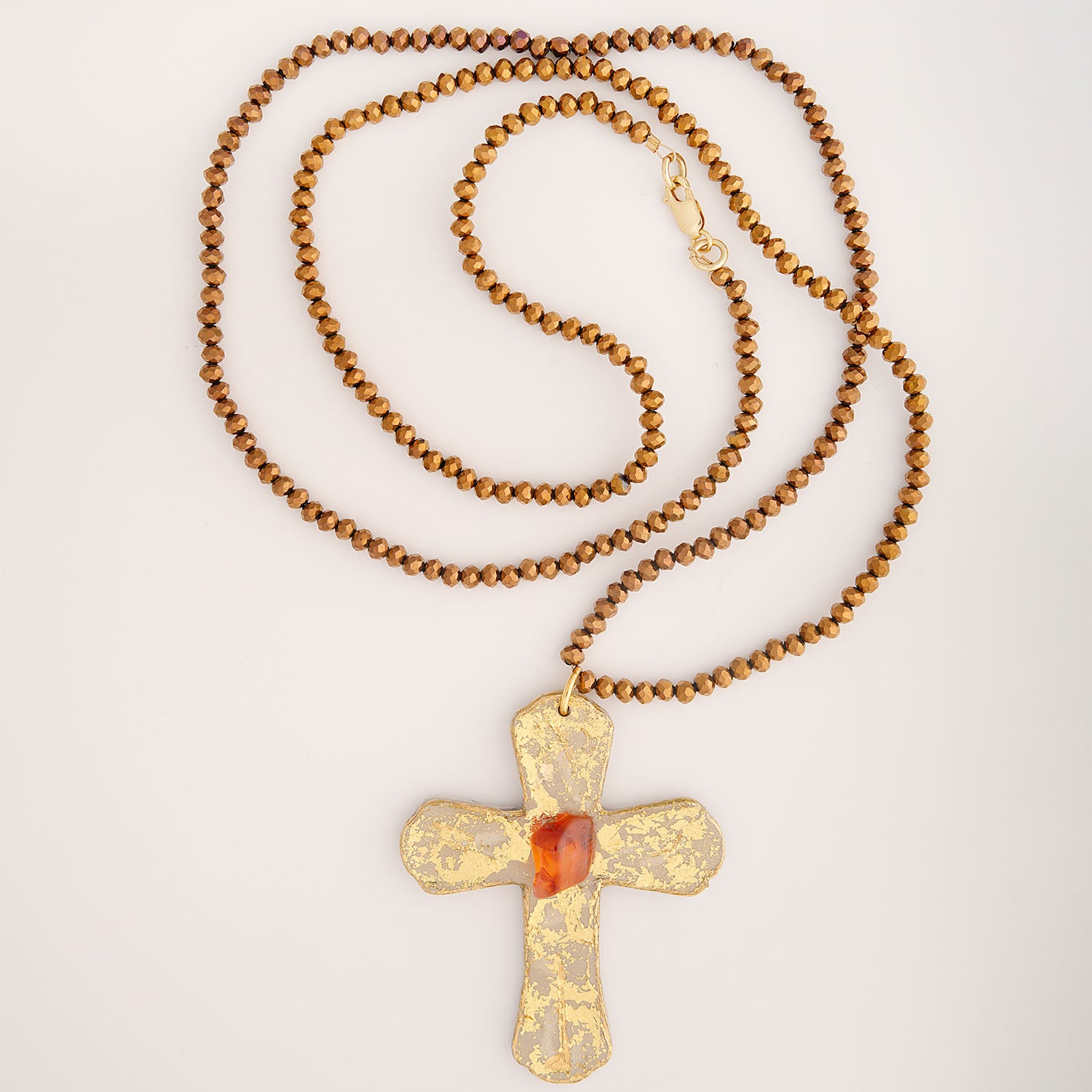 Collar con cristales de Swarovski, los cuales contrastan con el Jaspe Carneola Naranja, el cual le da brillo y un estilo rompedor a esta impresionante cruz en tonos dorados.