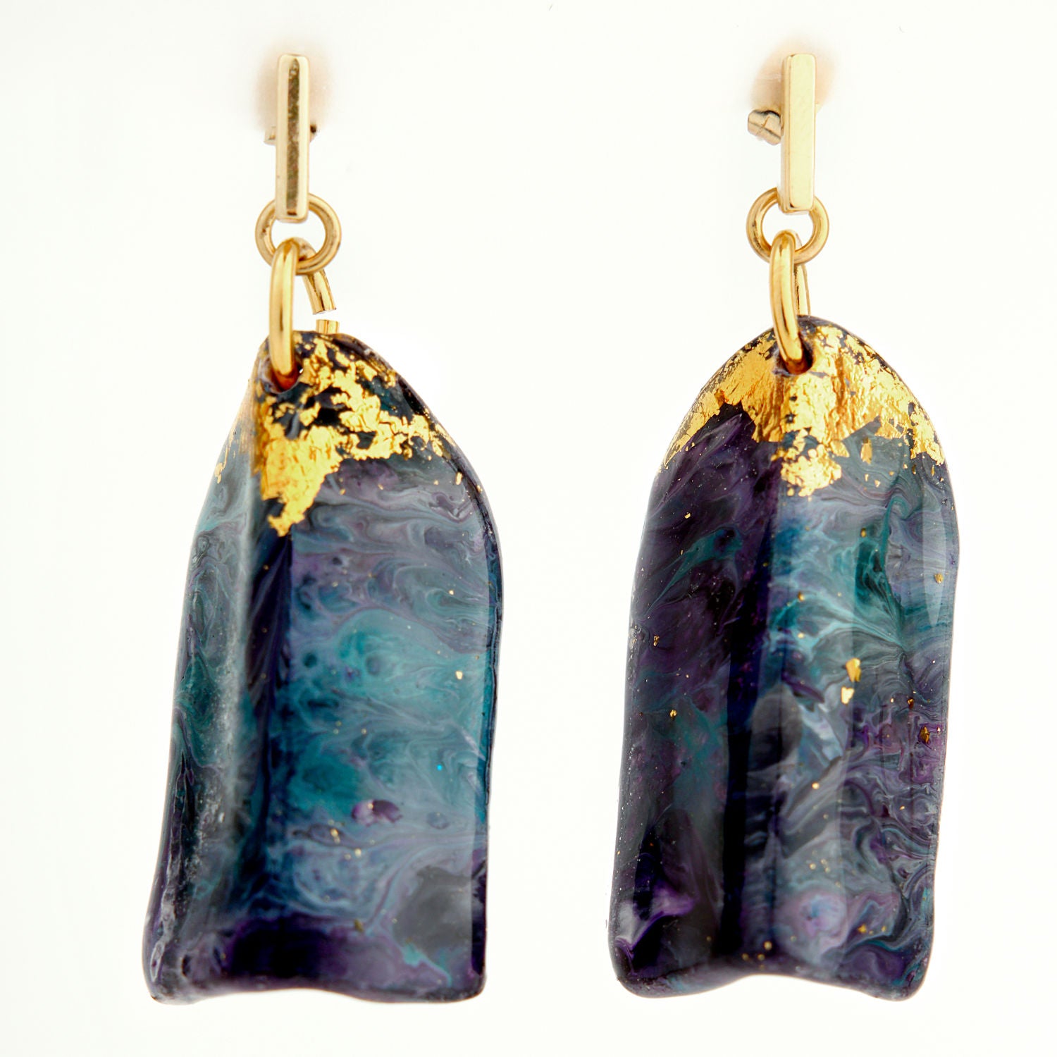 Originales y ligeros pendientes en forma bizantina, realizados con papel bajo la técnica del Pouring, predominando los colores dorado, negro y turquesa.