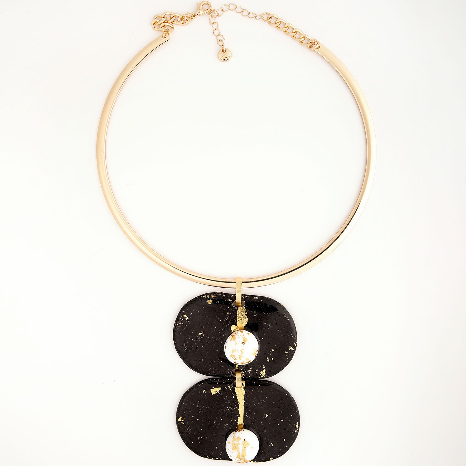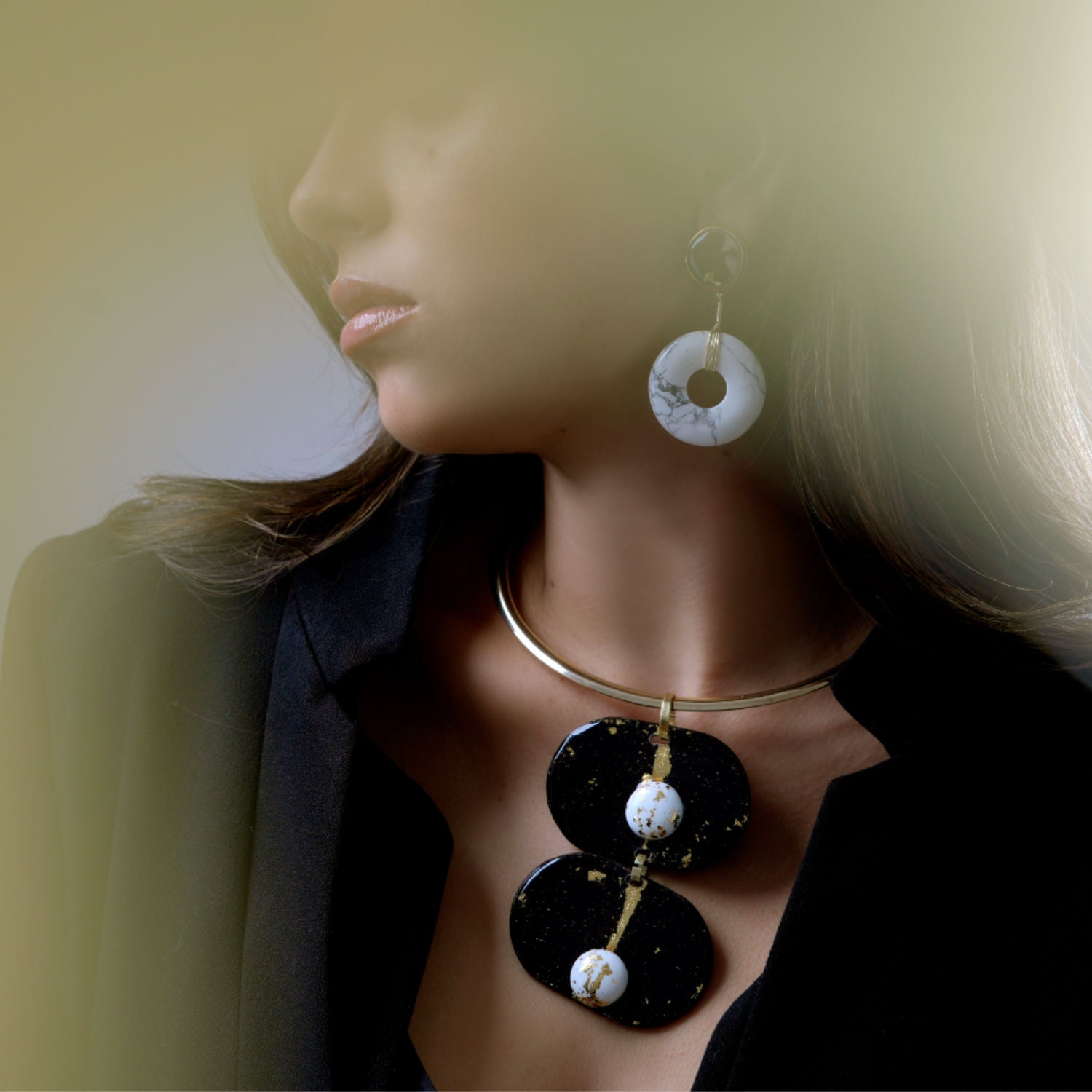 Óvalos negros realizados en papel azabache, coronados con dos Howlitas en su tope, dándole carácter en sus líneas limpias a esta pieza